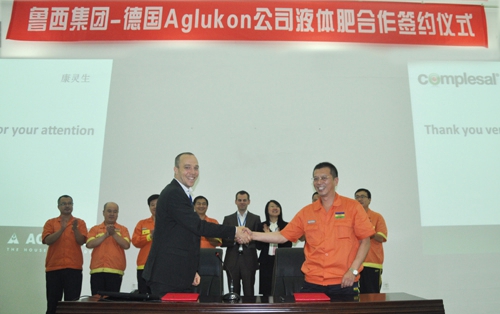 簽約儀式上,來(lái)訪客人首先介紹了德國(guó)Aglukon公司概況、葉面肥、懸濁液肥料的特點(diǎn)以及在作物栽培方面的應(yīng)用效果。雙方還就液體水溶肥在國(guó)內(nèi)合作生產(chǎn)、銷售等方面問(wèn)題交換了意見(jiàn)。隨后,德國(guó)Aglukon公司的市場(chǎng)營(yíng)銷兼研發(fā)部總經(jīng)理Benjamin Klug先生和魯西化肥工業(yè)集團(tuán)副總經(jīng)理李書(shū)海在協(xié)議書(shū)上簽字。